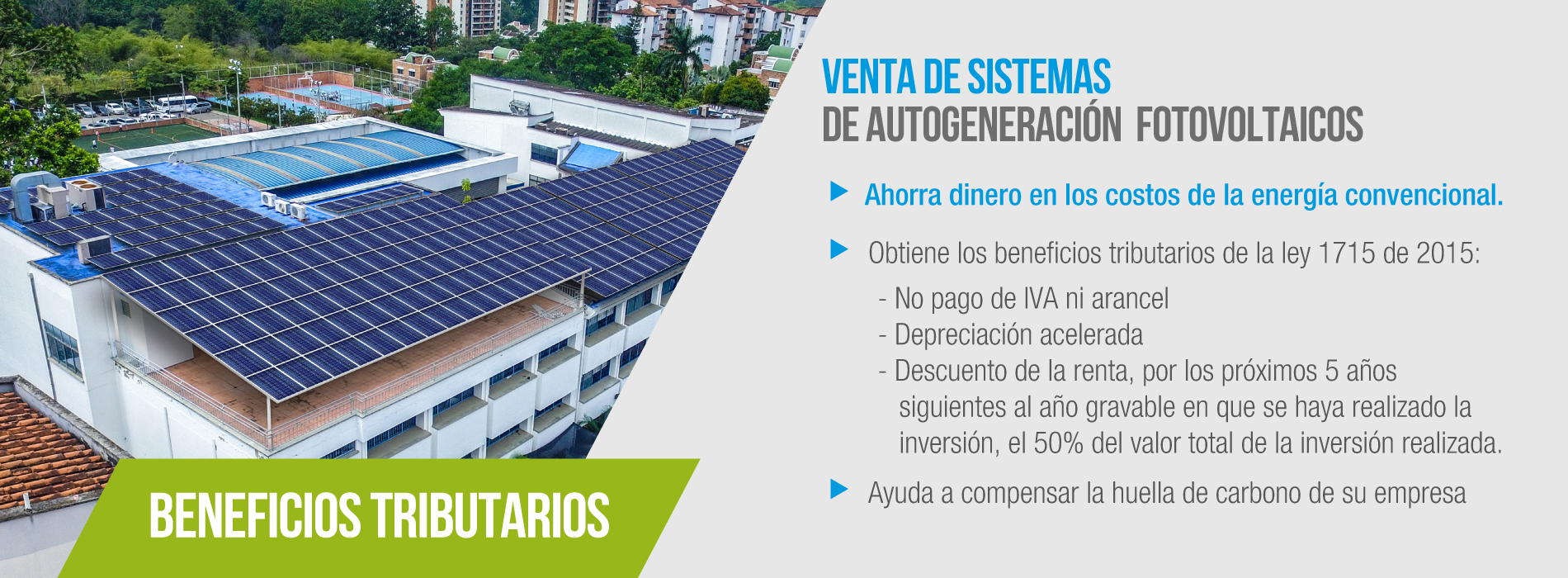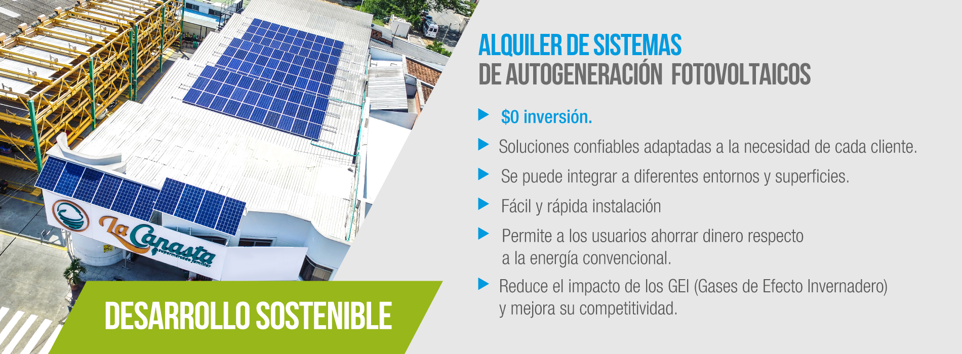 Suministramos los elementos necesarios que conforman el sistema de autogeneración con tecnología fotovoltaica en las instalaciones de nuestros clientes para que supla los requerimientos energéticos con el fin de mejorar la calidad del servicio de energía, a un costo fijo y contribuyendo al medio ambiente.